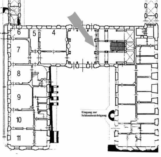 Grundriss ErdgeschossDer Pfeil weist auf das berühmte, von Balthasar Neumann entworfene, Treppenhaus.