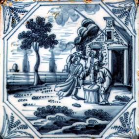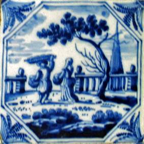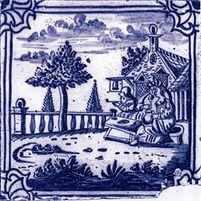 Fliesenmaler übernahm die Personen, den Baum und die Balustrade; das Tor