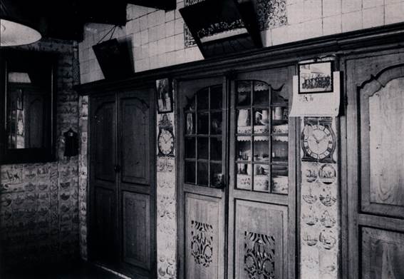 Hetzelfde interieur als van fig. 13. Bedsteewand met ter weerszijden van de glazenkast een strook bijbeltegels met een tableau met de voorstelling van een pendule met zes tegels, Romeinse cijfers, en wijzers die de tijd op zeven voor twee aangeven.