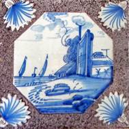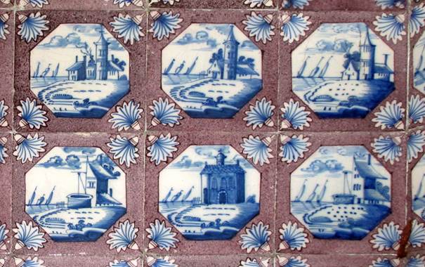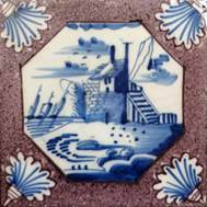 Fliesen mit blau gemalten Landschaften im Achteck auf manganfarben gespritztem Untergrund und ausgesparter Nelke als Eckmotiv.